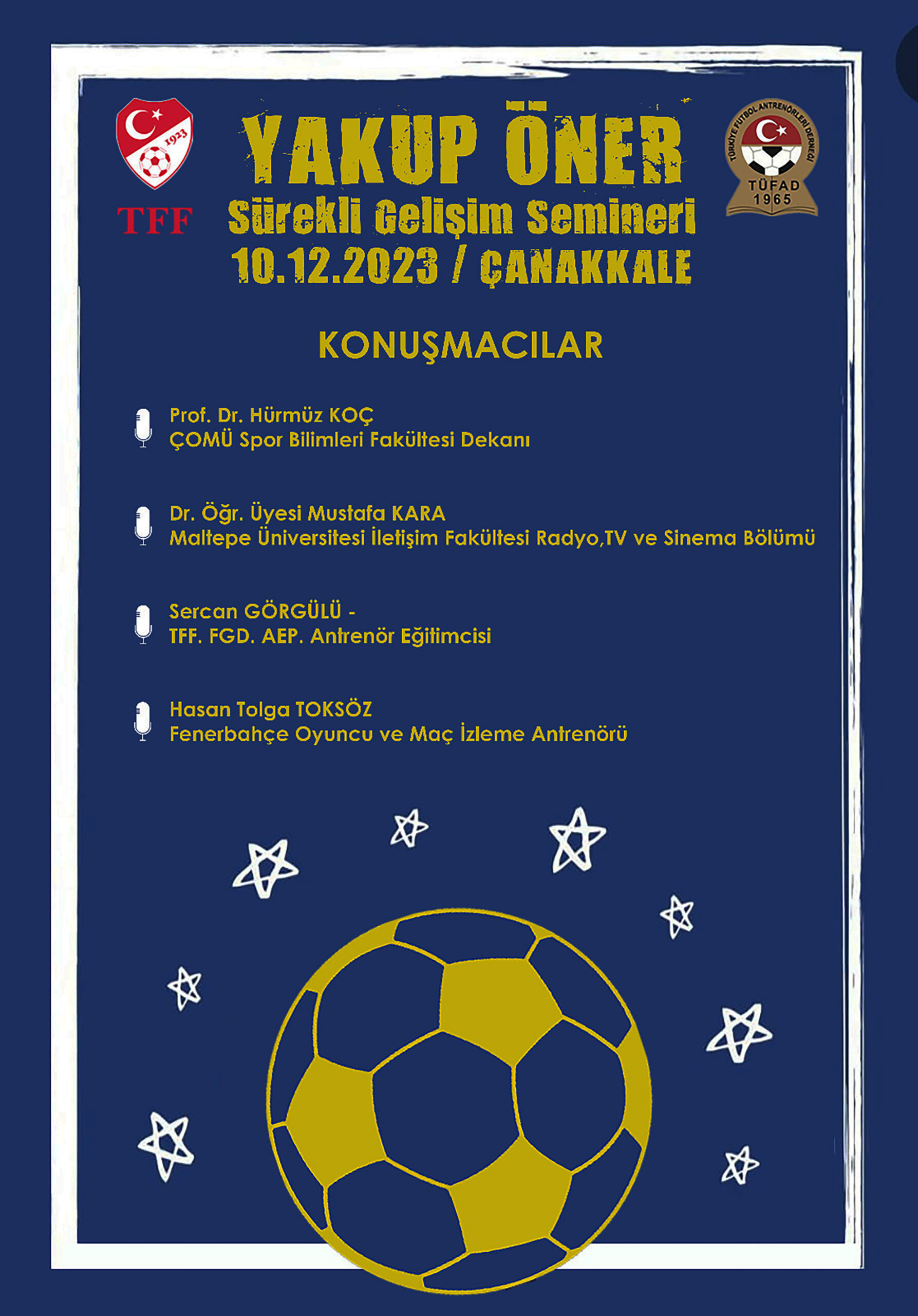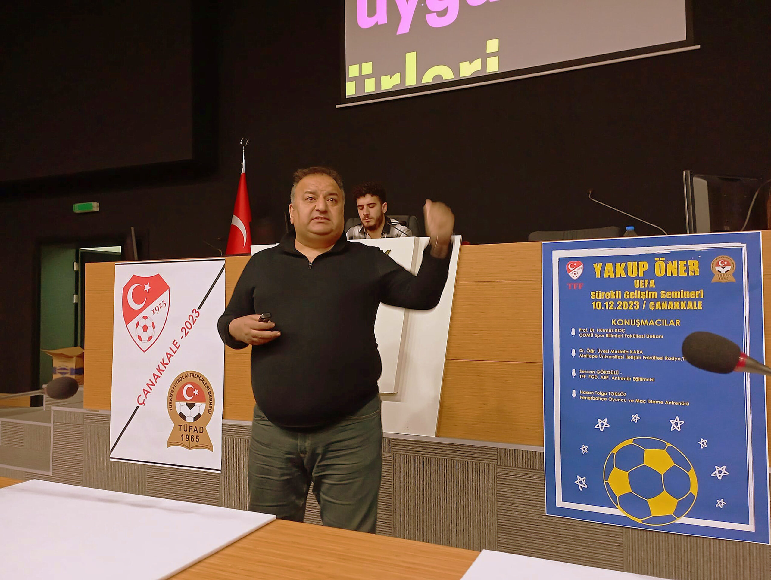 Radyo, Televizyon ve Sinema Bölümü hocalarımızdan Dr. Öğr. Üyesi Mustafa Kara, Türkiye Futbol Federasyonu ve TÜFAD (Türkiye Futbol Antrenörleri Derneği) Çanakkale Şubesi tarafından UEFA lisanslı antrenörler için gerçekleştirilen sürekli eğitim seminerinde “Futbolda İletişim Analizi” başlığı ile eğitim verdi.