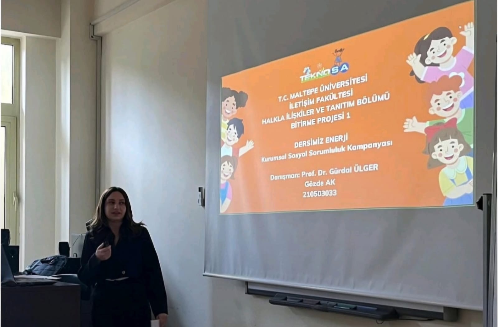 İlk bitirme projem, Teknosa markası için hazırladığım “Dersimiz Enerji” adlı bir kurumsal sosyal sorumluluk kampanyasıydı. Bu proje, çevresel sürdürülebilirlik konusunda ilkokul ve ortaokul öğrencilerini bilinçlendirmeyi hedefliyordu. Kampanya kapsamında çocuklara enerji verimliliği, tasarruf, sürdürülebilir enerji kaynakları ve bilinçsiz enerji tüketiminin çevreye olan zararları hakkında eğitim verilmesini içeriyordu. Projenin, bireysel mesken elektrik tüketiminin en yüksek olduğu şehirlerden (Antalya, İzmir ve Muğla) başlayarak sürdürülebilir şekilde devam etmesini amaçlamıştım.